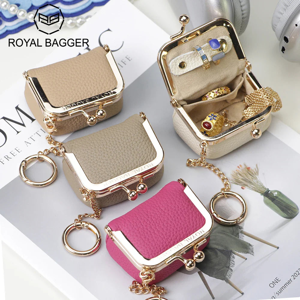 Royal Bagger Genuine Leather Mini Kiss Lock Coin & Jewelry Box, Removable Keychain, Storage for Rings, Earrings, Necklaces 2894