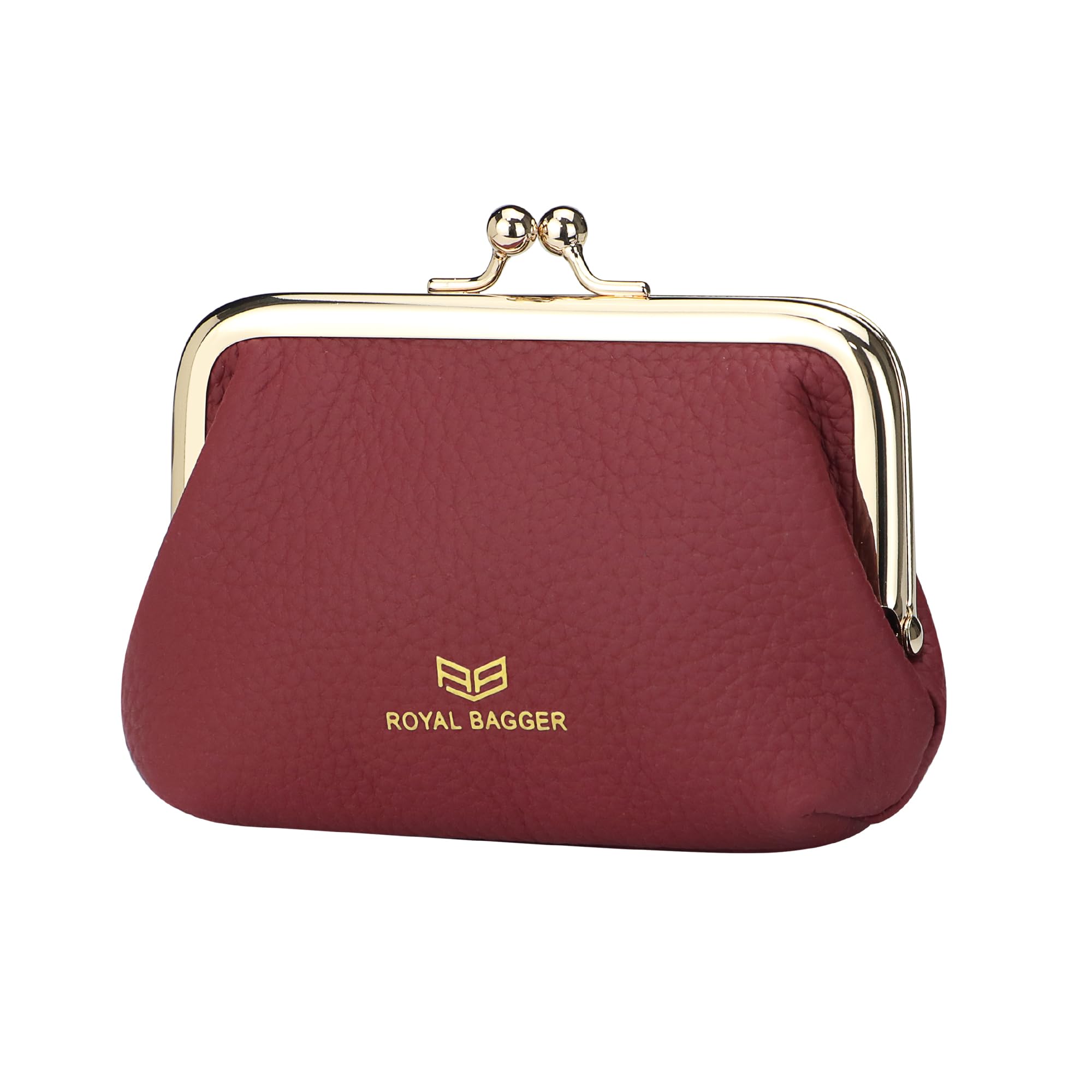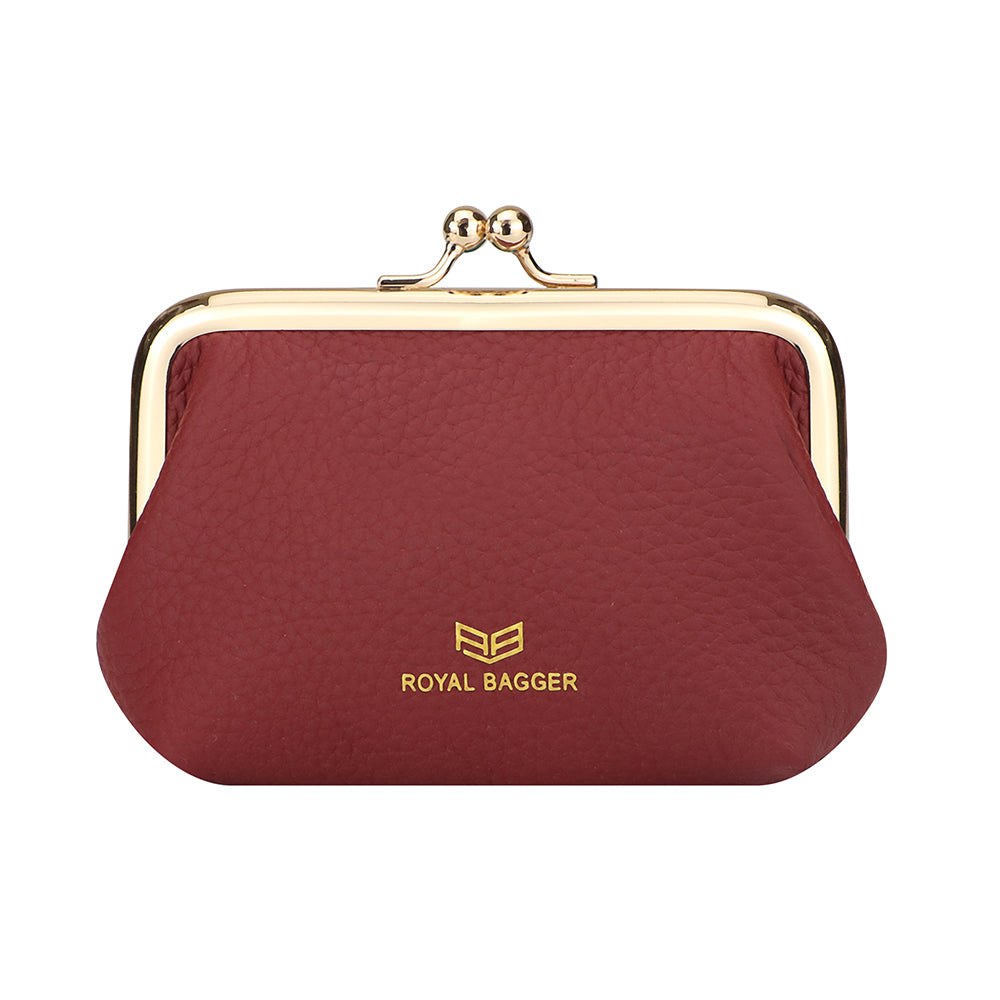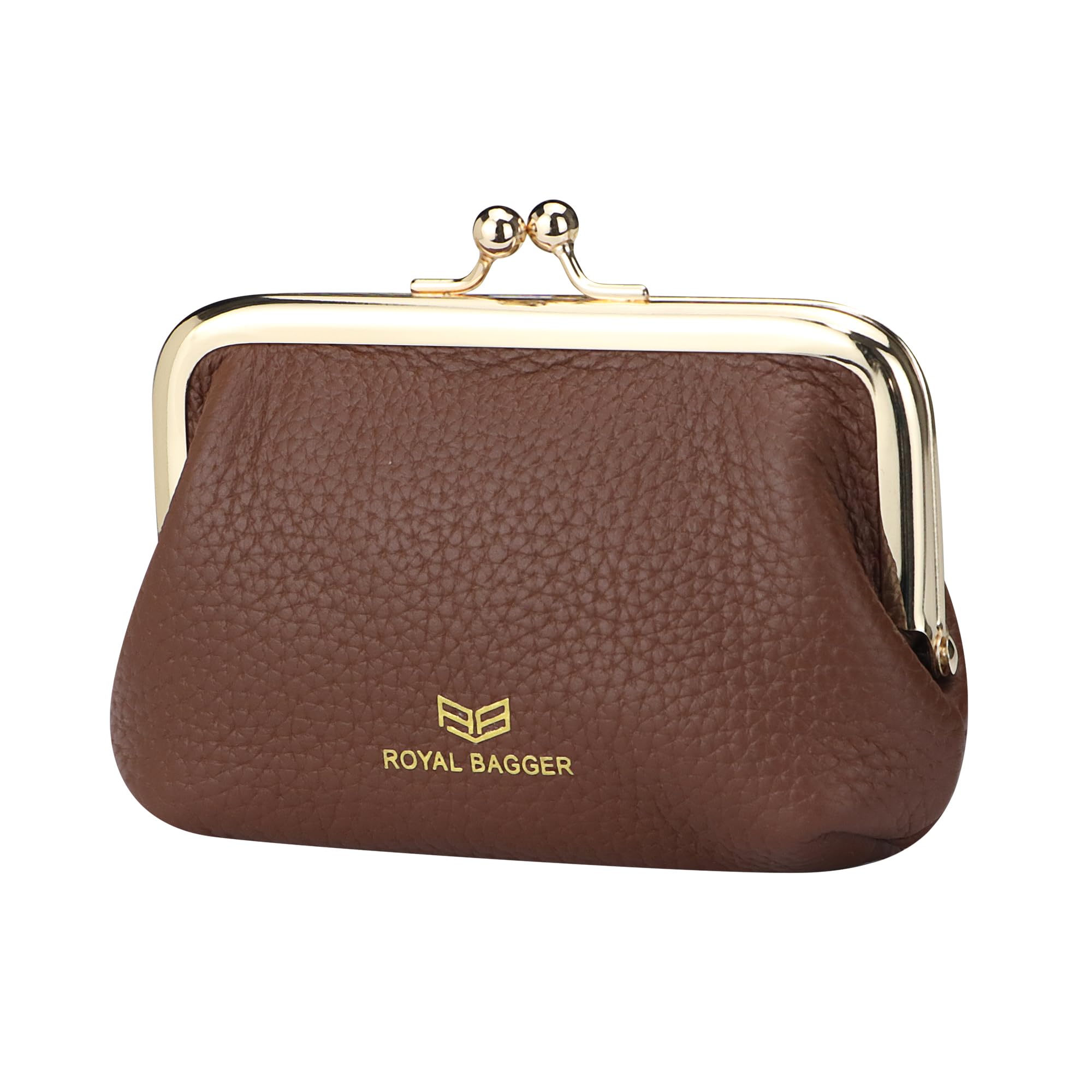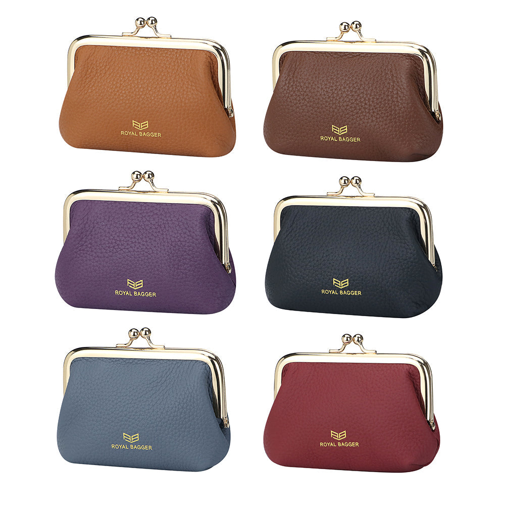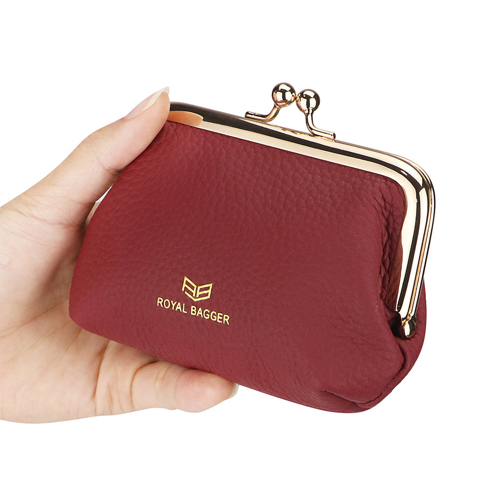 Royal Bagger Kiss Lock RFID Card Holder & Coin Purse for Women. It is an exquisite and compact wallet made of high-quality cowhide material, with a stylish and practical appearance. It not only features a classic matching lock design for easy opening and closing, but also has built-in RFID technology to effectively protect your bank card information from theft. This mini wallet provides enough space to store your cards, change, and small items, and comes with a keychain for easy carrying. Whether for daily use or as a gift for family and friends, it appears both exquisite and practical.
