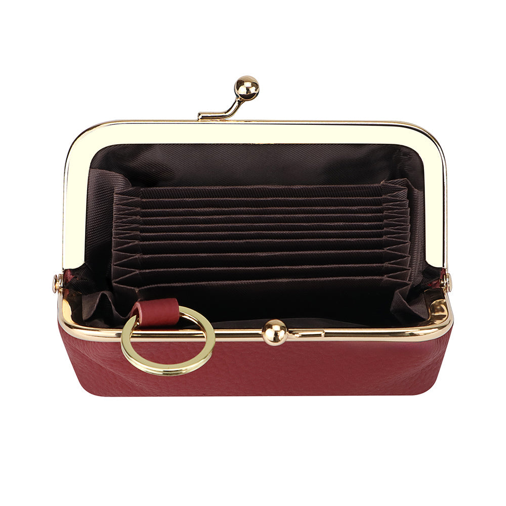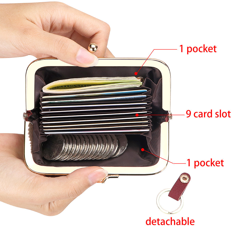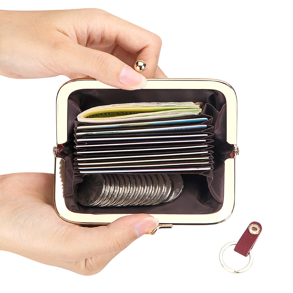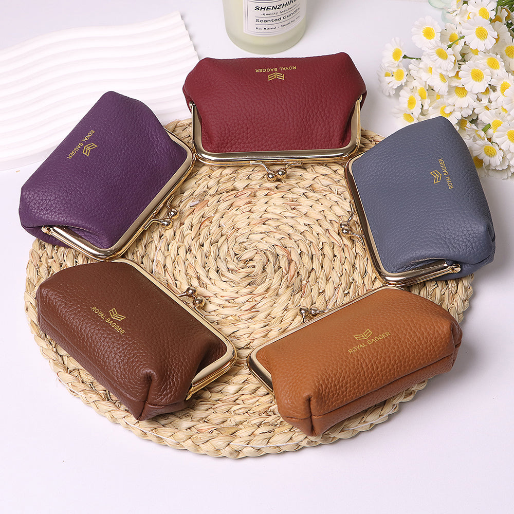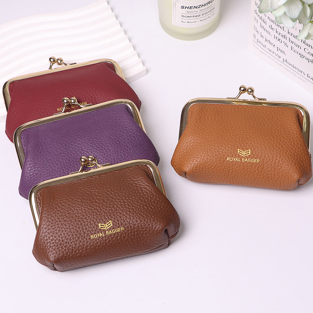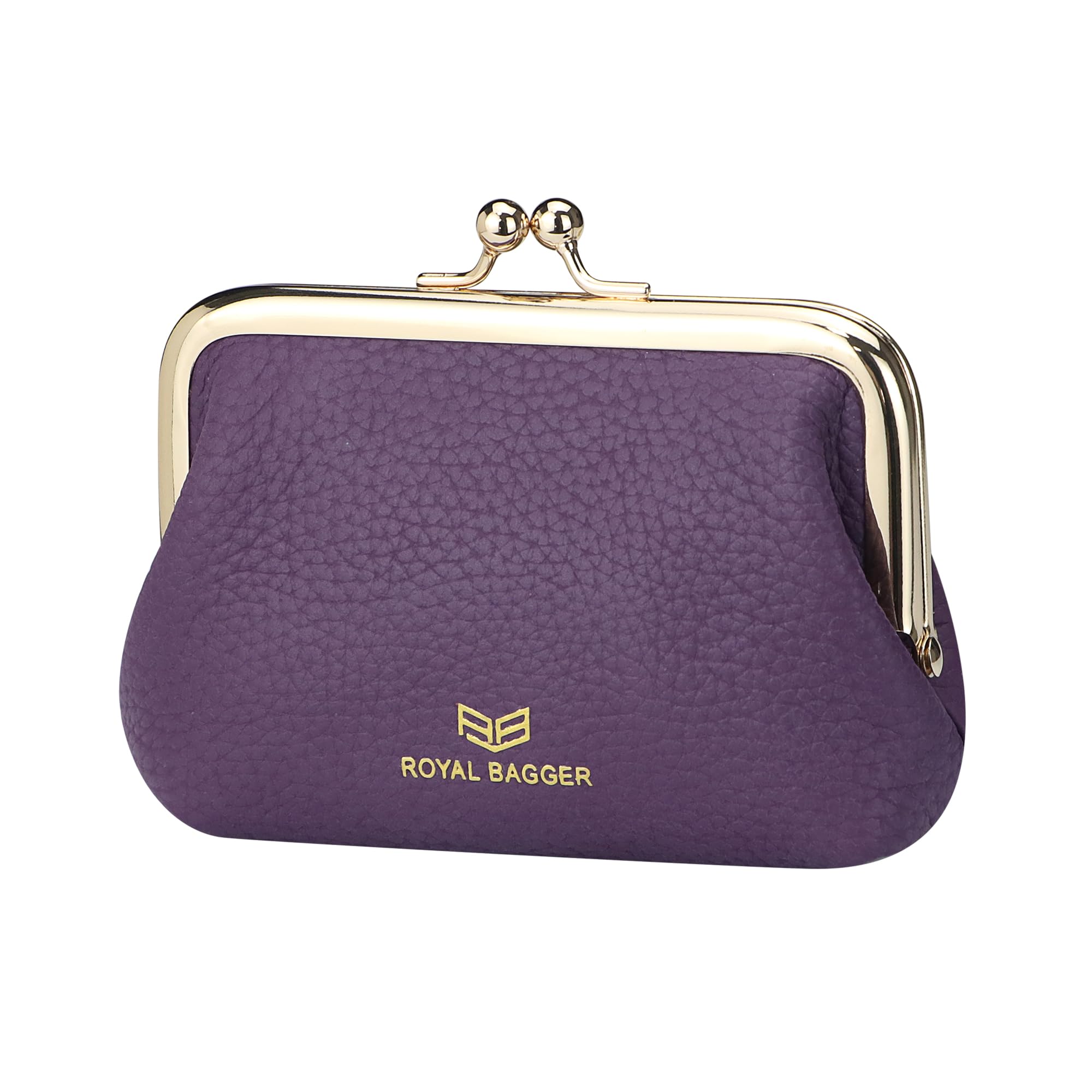 Royal Bagger Kiss Lock RFID Card Holder & Coin Purse for Women. It is an exquisite and compact wallet made of high-quality cowhide material, with a stylish and practical appearance. It not only features a classic matching lock design for easy opening and closing, but also has built-in RFID technology to effectively protect your bank card information from theft. This mini wallet provides enough space to store your cards, change, and small items, and comes with a keychain for easy carrying. Whether for daily use or as a gift for family and friends, it appears both exquisite and practical.