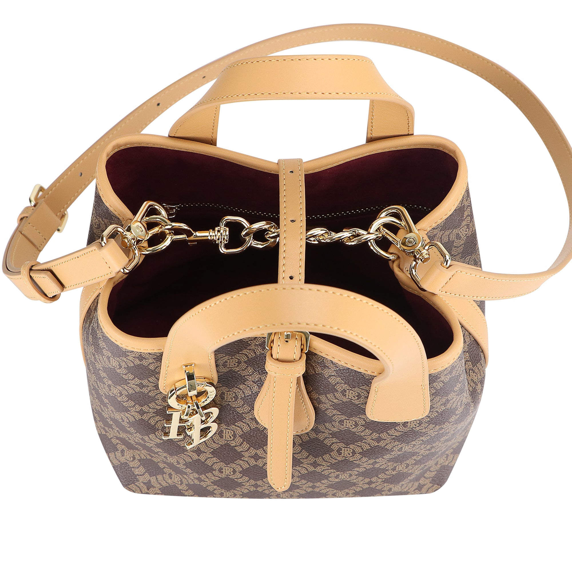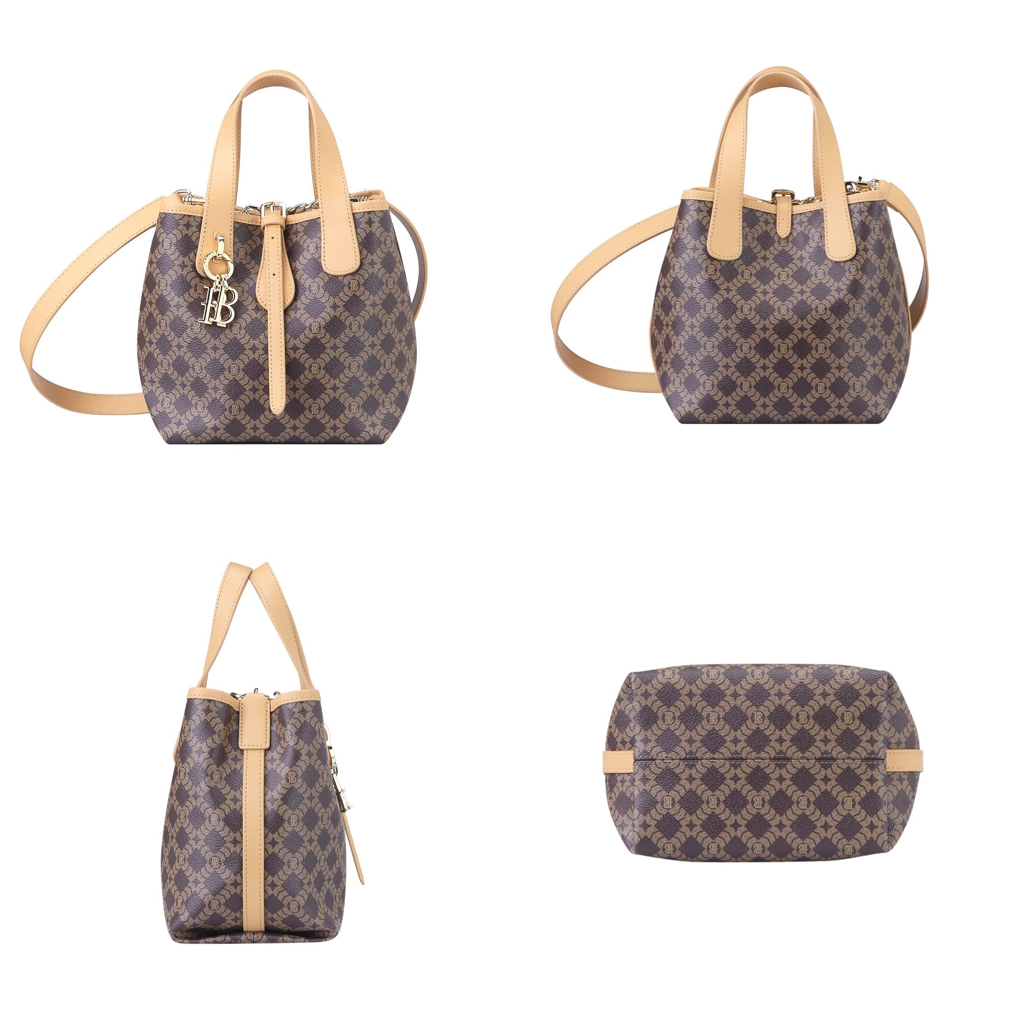 This ROYAL BAGGER convertible basket-bucket bag is made from durable coated canvas and vegetable-tanned cowhide, offering a structured yet soft feel with a premium look. Its standout design transforms between a basket tote and bucket bag, with adjustable openings via magnetic and pin buckles. The strap length can also be customized with a chain-style buckle.