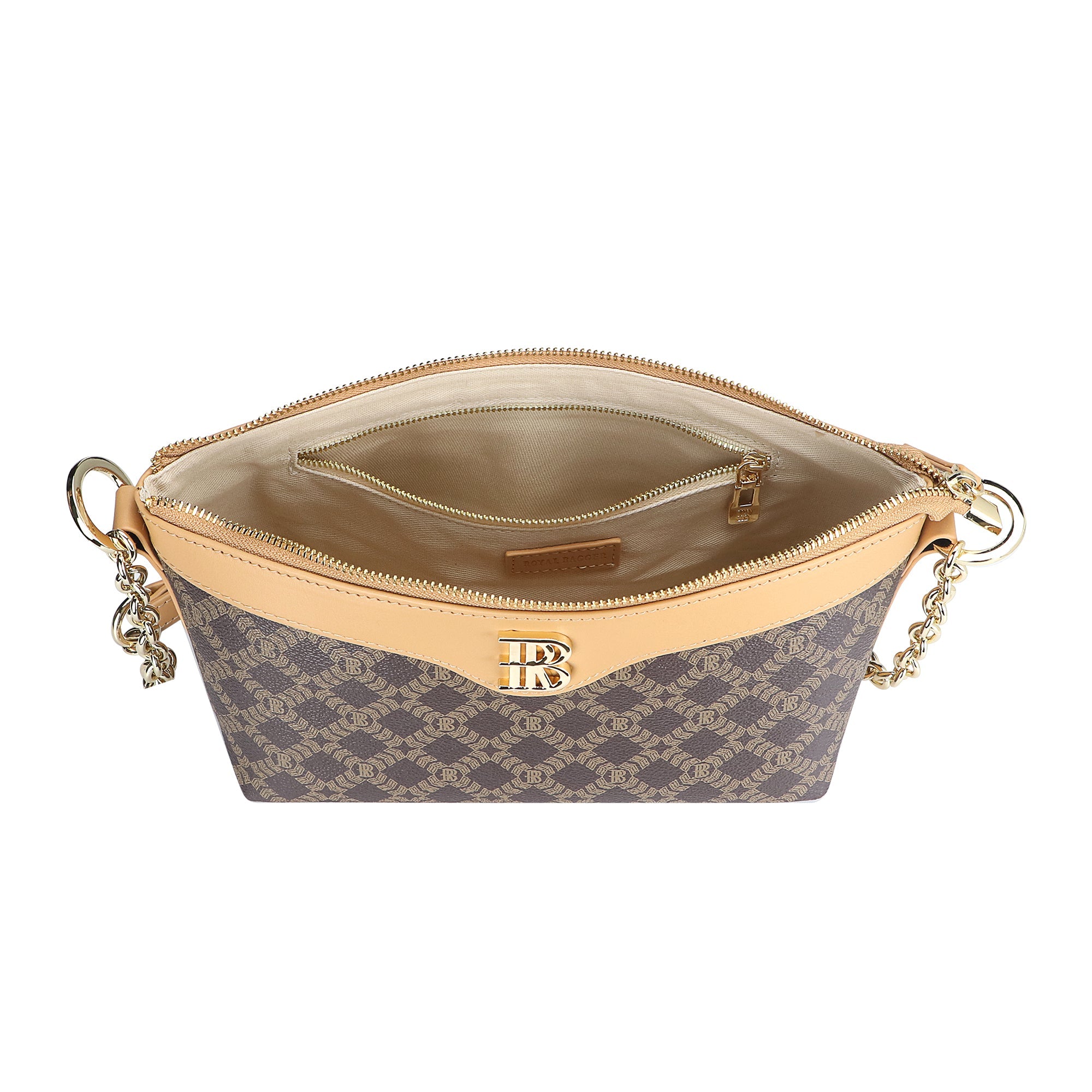 Designed with a leather-woven metal chain and an adjustable strap, it can be worn on the shoulder or carried by hand for versatile styling options. The front features the signature “RB” metal logo, adding a touch of brand elegance, while a smooth top zipper ensures your belongings stay secure.